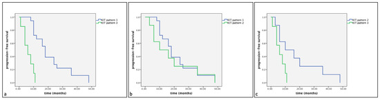 Kaplan–Meier survival graph comparing the three KIT staining patterns in term of progression-free survival times in dogs with MCTs treated post-surgery with TKI therapy. (a) KIT pattern 1 vs. KIT pattern 3; (b) KIT pattern 1 vs. KIT pattern 2; (c) KIT pattern 2 vs. KIT pattern 3.