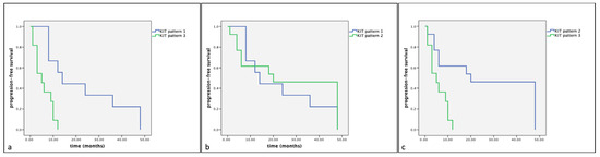 Kaplan–Meier survival graph comparing the progression-free survival times in the three KIT expression subclasses: (a) pattern 1, (b) pattern 2 and (c) pattern 3.