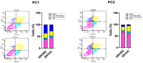 The main cell death mechanism differed among the cell lines. PC1 cells were more sensitive to ERCBD and ERTHC, with 36% and 27%, respectively, of the cells dying from necrosis, followed by late apoptosis (20% of the cells for both ERCBD and ERTHC). For PC2, the main mechanism of cell death was late apoptosis (17.2% and 24.6% for the ERCBD and ERTHC groups, respectively) (Figure 3 and Table 1).