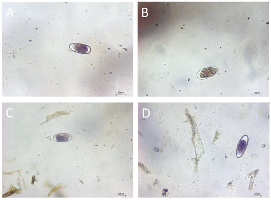 In this study, we employed a combination of the saturated salt water flotation method and the McMaster counting method to detect parasitic eggs in camel fecal samples. Initially, fecal samples were mixed with a saturated saline solution. The mixture was then strained to remove coarse particles, leaving behind a suspension enriched with eggs. This suspension was placed in a McMaster counting chamber. After allowing the chamber to rest for 5 min, enabling the eggs to float to the surface and settle evenly, the eggs were counted under a microscope.