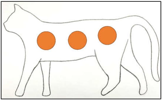 To harvest the samples, the cadavers were placed in lateral recumbency, and bilateral sections from the thorax, flank, and femur regions were selected. A total number of six samples from each cat were obtained (Figure 1). Thorax samples were taken immediately caudal to the forelimbs, flank samples were selected immediately posterior to the ribs, and femur samples were collected from the hind leg at approximately midthigh. All the harvested samples included the subcutis and underlying fascia.