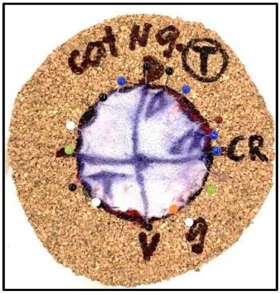 In contrast, the samples from the study group were fixed onto a 3 mm thick piece of corkboard with the deep fascial plane facing the board utilizing pinpoint needles to secure them in place on a previously drawn 50 mm diameter circle on the corkboard (Figure 2). This method aimed to maintain their original orientation and prevent the distortion of the samples.