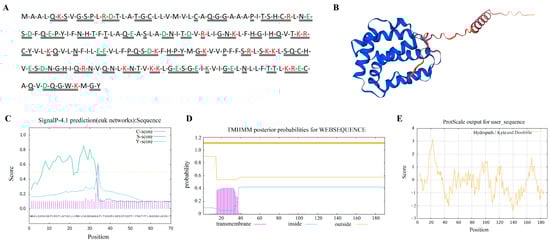 Molecular characteristics of yak IL-22 protein. (A) Amino acid sequence of IL-22 protein. Red text letters represent positively charged amino acids; green represents negatively charged amino acids; double solid lines represent hydrophobic residues. (B) Three-dimensional structure of IL-22 protein. (C) Prediction of IL-22 protein signaling peptide. (D) Prediction of IL-22 protein transmembrane structure. (E) Prediction of hydrophilicity of IL-22 protein.