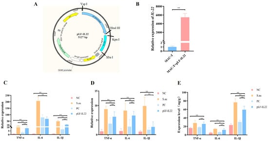 Construction and antibacterial effect of pLF-IL22. (A) Plasmid construction map of pLF-IL22. (B) Overexpression of pLF-IL22 plasmid in MAC-T cells (n = 3). (C) RT-qPCR test of inflammatory factors expression in cell therapy (n = 3). (D) RT-qPCR test of inflammatory factors expression in the treatment of mastitis in mice (n = 6). (E) Protein contents of inflammatory cytokines in serum of mice (n = 6). Differences were considered significant at p < 0.05 (*). Differences were considered very significant at p < 0.01 (**).