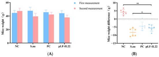 The body weight of mice may be related to the development of the disease. The initial body weight of all mice was not significantly different, but the body weight of the mice in each group changed significantly after treatment (Figure 4A). Except for the NC group, the weights of the other three groups of mice were reduced. The body weight of the S. au group decreased significantly, followed by the pLF-IL22 group and the PC group (Figure 4B).