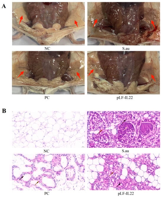 S. aureus infection can lead to mammary gland lesions. In the S. au group, the trunks of the mice were thin and small, and there were obvious bleeding points in the mammary glands. There was a certain degree of mammary gland swelling and erosion, which was very different from the NC group. The PC group and pLF-IL22 groups showed mild inflammatory symptoms, such as dry and red mammary glands (Figure 5A). The breast paraffin sections intuitively clarified the therapeutic effect. No obvious lesions were found in the NC group. After S. aureus infection, acinar expansion, acinar epithelial cell degeneration (black arrow), and glandular epithelial cells with occasional necrosis (red arrow) were observed. The glandular cavity was filled with secretions and inflammatory cells (yellow arrow). The inflammatory response was alleviated, the degeneration and necrosis of epithelial cells were reduced, and the degree of inflammatory cell infiltration was low 48 h after plasmid injection (Figure 5B).