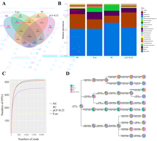 Each operational taxonomic unit (OTU) is usually considered a microbial species. The numbers of OTUs in the NC group, S. au group, PC group, and pLF-IL22 group were 820, 872, 878, and 904, and the numbers of unique OTUs were 373, 389, 687, and 495, respectively. The number of total OTUs was 121 (Figure 6A). At the class level, pLF-IL22 increased the relative abundance of Bacille, and Gammaproteobacteria decreased compared with the NC group and S. au group. pLF-IL22 increased the relative abundance of Lachnospiraceae and Bacteroidia, and Clostridia and Bacteroidanceae decreased compared with the NC group and S. au group (Figure 6B). Lincomycin induced the greatest changes in the intestinal flora. The species classification tree statistics reflect the top 10 genera with the highest relative abundances (Figure 6D). The sample dilution curve reflects the sequencing depth of microorganisms (Figure 6C), and the flat curve indicates that the number of species in this environment did not increase significantly with sequencing [].