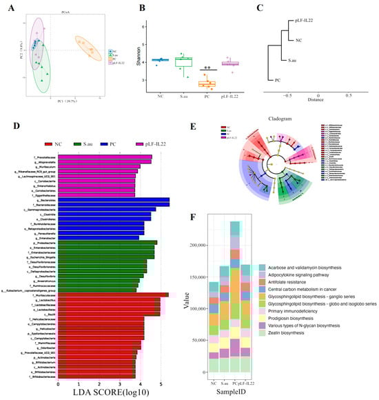 β-diversity analysis showed that there was no significant difference between the NC group, S. au group, and pLF-IL22 group, but there were significant differences in the structure and composition of the intestinal bacterial community in the PC group (Figure 7A). The Shannon index was used to measure the species diversity. As shown in Figure 7B, the pLF-IL22 group did not significantly change the intestinal colonies of mice, and even the S. au group did not show significant differences, but the changes in the intestinal tract of mice by lincomycin were significant. The results of the cluster analysis show that the pLF-IL22 group was first clustered with the NC group, followed by the S. au group, and, finally, the PC group (Figure 7C). Linear discriminant analysis (LDA) and taxonomic cladograms effect size (LEfSe) analysis can find important and significantly different species between groups (Figure 7D). In the pLF-IL22 group, we found Prevotellaceae enrichment at the family level and Alloprevotella enrichment at the genus level. The enrichment of Bacteroides at the family and genus levels, Gammaproteobacteria at the class level, Clostridiales at the class and order levels, Burkholderiaceae at the family level, Betaproteobacteriales at the order level, Parasutterella at the genus level were observed in the PC group. In the S. au group, we found Proteobacteria enrichment at the phylum level, Enterobacteriaceae enrichment at the order and family levels, Escherichia-shigella enrichment at the genus level, Desulfovibrio at the order, family, and genus levels, and Deltaproteobacteria enrichment at the class level. In addition, in the NC group, we observed the enrichment of Muribaculaceae at the family level, Lactobacillus at the order, family, and genus levels, Bacilli at the class level, Helicobacter at the family and genus levels, Campylobacterales at the class and order levels, and Epsilonbacteraeota at the phylum level. The results of the taxonomic cladograms are basically the same (Figure 7E).
