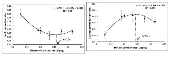 Table 3 shows that the weight gain rate (WGR) and specific growth rate (SGR) were affected by dietary cobalt levels. The control group (0.129 mg/kg diet) showed significantly lower WGR and SGR than all other groups (p < 0.05), unlike the feed conversion ratio (FCR), where it showed significantly higher values than all other groups (p < 0.05). In addition, dietary cobalt levels did not affect the survival rate (SR) within groups (p > 0.05). Quadratic regression analyses based on SGR (R2 = 0.952) and FCR (R2 = 0.957) showed that the optimal dietary cobalt requirement was 0.24 and 0.26 mg/kg of diet, respectively (Figure 1).