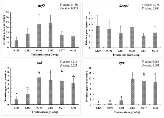 Figure 2 shows that dietary cobalt levels did not affect the nrf2 and keap1 mRNA expression levels (p > 0.05). In addition, the sod mRNA levels were markedly upregulated at the 0.201 mg/kg, 0.233 mg/kg, and 0.277 mg/kg dietary cobalt levels compared with the control group (p < 0.05). Interestingly, this phenomenon was apparent when the dietary cobalt level reached 0.233 mg/kg, and the mRNA levels of gpx were upregulated compared with the control group (p < 0.05).