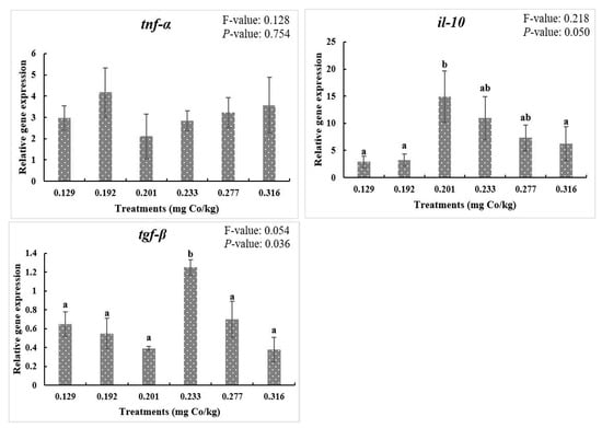 As shown in Figure 3, dietary cobalt levels did not affect the nf-kb, il-8, and tnf-α mRNA expression levels (p > 0.05). Moreover, the mRNA levels of il-10 at the 0.201 mg/kg dietary cobalt level exhibited a higher value than the control group (p < 0.05). In addition, the mRNA levels of tgf-β were also higher at the 0.233 mg/kg dietary cobalt level than all the remaining levels (p < 0.05).