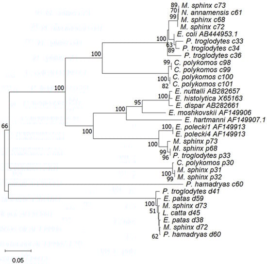 Prevalence of Entamoeba spp. identified among NHPs according to host species is summarized in Table 5. Out of the 14 NHPs, seven were detected by Entamoeba spp., including Colobus polykomos, Erythrocebus patas, Lemur catta, Mandrillus sphinx, Nomascus annamensis, Pan troglodytes, and Papio hamadryas. The highest prevalence was observed in Colobus polykomos at 83.3% (5/6). Colobus polykomos also had the highest rate of E. coli detection at 66.7 (4/6). The highest rate of E. dispar detection was found in Erythrocebus patas at 66.7 (2/3), while Mandrillus sphinx had the highest rate of E. polecki detection at 44.4 (4/9). The prevalence of Entamoeba spp. detections varied significantly among different NHP species (p < 0.01). Prevalence of Entamoeba spp. identified among NHPs according to zoos and host species is summarized in Table 6; Fisher’s exact test results show that the prevalence of Entamoeba spp. in Beijing Zoo and Shijiazhuang Zoo was significantly different among NHPs (p < 0.01) but not in Guizhou Zoo NHPs (p > 0.01). The constructed phenetic tree (Figure 1) illustrates the assignment of Entamoeba spp. within hosts, demonstrating that the affinities of Entamoeba spp. were similar among the same species of NHPs. Mandrillus sphinx had the highest rates of mixed detections, including one case of E. coli and E. polecki (M. sphinx 68, Beijing), one case of E. coli and E. dispar (M. sphinx 72, Beijing), and one case of mixed detection by all three Entamoeba spp. (M. sphinx 73, Beijing). In addition, a mixed detection of E. coli and E. dispar was found in Papio hamadryas (P. hamadryas 60, Beijing), and a mixed detection of E. coli and E. polecki was found in Pan troglodytes (P. troglodytes 33, Shijiazhuang).
