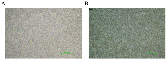 Leg myoblasts were isolated from 13-embryo-old duck embryos and underwent three differential attachments to obtain proliferating primary myoblasts (GM) with fibroblasts removed (Figure 1A). After inducing differentiation, myotube growth and enlargement were evident at 48 h, as depicted in Figure 1B.