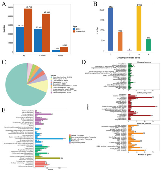 A thorough alignment of non-redundant transcripts against established annotations from the duck reference genome (https://useast.ensembl.org/Anas_platyrhynchos_platyrhynchos/Info/Indexin (accessed on 9 July 2024)) led to the discovery of 5797 novel transcripts (Figure 2A). The distribution of these novel transcripts is depicted in Figure 2B. Among these, 1229 were annotated in at least one database, revealing significant entries, including 997 transcripts identified in the KEGG database, 557 in the Pathway database, 1197 in the Nr database, 1216 in Uniprot, 591 in GO, and 25 in KOG (Table 4). Specifically, the Nr database annotation showed that 639 transcripts matched with green-headed mallards, 89 with crested ducks, and 45 with black swans (Figure 2C). Further analysis using GO enrichment revealed that these new transcripts were mainly linked to cellular components like the nucleus, integral membrane components, and cytoplasm. In terms of molecular function, there was notable enrichment for metal ion binding and ATP binding (Figure 2D). Additionally, KEGG pathway analysis indicated significant involvement in pathways associated with the immune system, general overview maps, and signaling processes (Figure 2E).