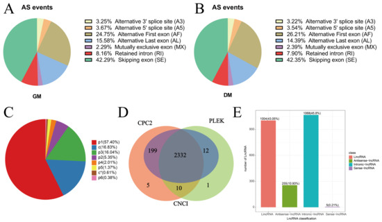 Alternative splicing types. SSR analysis and lncRNA identification. (A) Average percentage of each type of alternative splicing in GM samples. (B) Average percentage of each type of alternative splicing in DM samples. (C) Number and type of SSRs. (D) Venn diagram of predicted lncRNAs by the CNCI, CPC, and PLEK. (E) Statistics of lncRNA number.