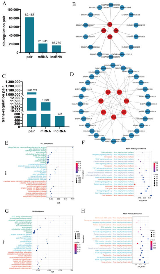 LncRNAs’ function prediction. (A) Number of cis-regulated lncRNA mRNA pairs. (B) Cis-acting lncRNAs on muscle-related genes. (C) Number of trans-regulated LncRNA mRNA pairs. (D) Trans-acting lncRNAs on muscle-related genes. (E) GO enrichment analysis of the cis-regulated target gene. (F) KEGG analysis of the cis-regulated target gene. (G) GO enrichment analysis of the trans-regulated target gene. (H) KEGG analysis of the trans-regulated target gene.