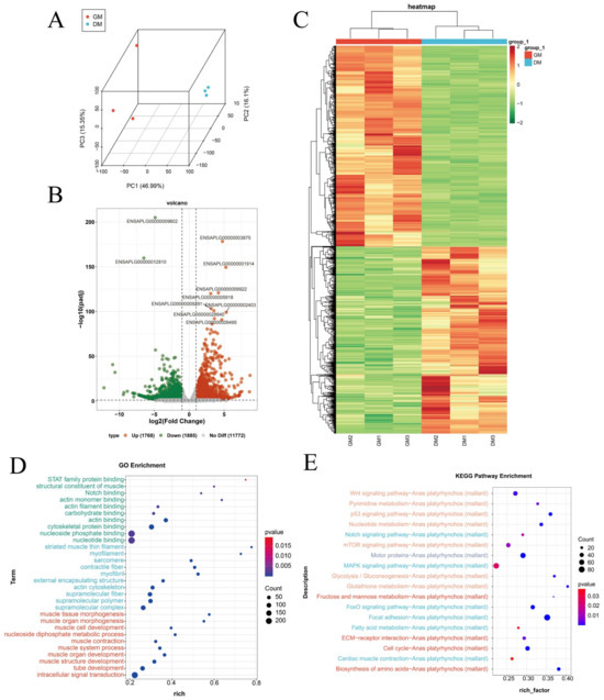 Principal component analysis (PCA) revealed distinct clustering between GM and DM conditions, with replicates within the DM group showing strong similarity (Figure 5A). A total of 3653 differentially expressed genes (DEGs) were identified when comparing GM and DM samples, consisting of 1768 upregulated and 1885 downregulated genes (Figure 5B, Supplementary Table S10). Hierarchical clustering based on expression levels revealed clear relationships among the samples and DEGs, illustrated through heatmap representations (Figure 5C). Enrichment analyses of the DEGs revealed significant links to various biological processes, especially those connected with muscle structure development, muscle organ development, tissue morphogenesis, and organ morphogenesis. Cellular composition terms were enriched for elements like myofibrils, contractile fibers, sarcomeres, and the actin cytoskeleton. Furthermore, molecular function terms prominently featured actin binding, structural constituents of muscle, and binding to actin filaments (Figure 5D). KEGG pathway analysis indicated that these DEGs were mainly enriched in the FoxO signaling pathway, along with the cell-cycle, ECM–receptor interaction, and MAPK signaling pathways (Figure 5E).