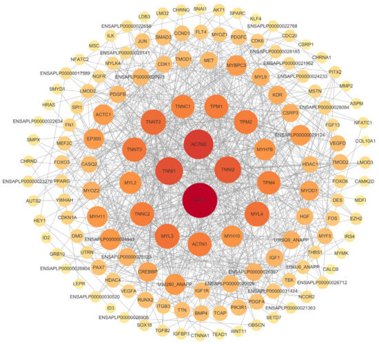To investigate interactions among the DEGs, we constructed protein–protein interaction networks using STRING. This network approach enabled a quick and intuitive understanding of the complex gene regulatory networks involved in skeletal muscle development (Figure 6). Within this network, MYL1, ACTN2, TNNI1, and TNNI2 were identified as central genes due to their high connectivity, suggesting crucial roles within the regulatory frameworks.