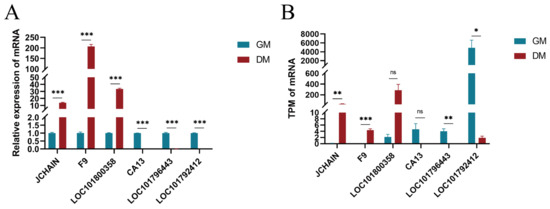 To validate the accuracy of our sequencing data, we randomly selected six genes (JCHAIN, F9, LOC101800358, CA13, LOC101796443, LOC101792412) from the pool of 3653 differentially expressed genes for validation through RT-qPCR. The experimental results supported the sequencing findings, strengthening the credibility of our transcriptomic data (Figure 7).
