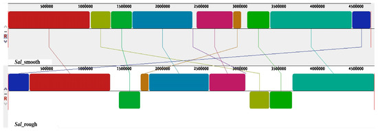 High genomic similarities between the whole genome sequences of Sal_smooth and Sal_rough. Pairwise alignment of the Sal_smooth and Sal_rough genomes was conducted using Mauve software. Colored blocks represent homologous (similar) regions, with connecting lines indicating shared sequences between the two genomes. Blocks below the center line indicate regions aligned in reverse complement (inverse) orientation. These homologous regions are called Locally Collinear Blocks (LCBs). A total of ten (n = 10) LCBs were identified, with a minimum weight of 3099, indicating strong homology and high similarity between the strains.