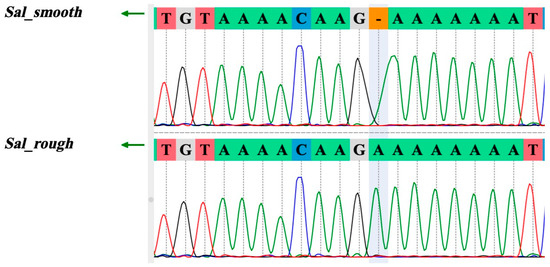 The most notable difference was a frameshift mutation in the Wzz(fepE) gene of Sal_rough, caused by an adenine (A) insertion after nucleotide position 32, extending its length from 1137 bp to 1138 bp (Figure 2). This mutation resulted in an early stop codon at position 26 in the 378 amino acid Wzz(fepE) protein, causing truncation that renders it a pseudogene. Importantly, sequencing analysis further confirmed that the Wzz(fepE) mutation, characterized by the inserted adenine base, was present in Sal_rough but absent in Sal_smooth (Figure 2). Consequently, this mutation was unique to Sal_rough and remained stable over 20 days of serial passages.