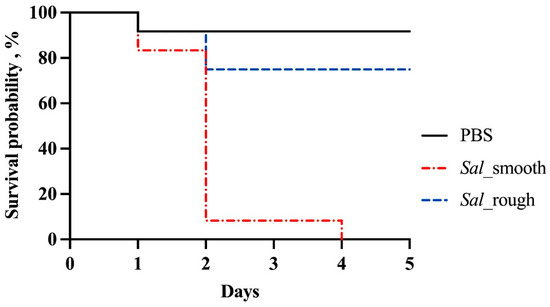 Chicken embryo lethality rate of S. Infantis strains. Twelve (12) eggs were used in each experimental group except the negative control (10 eggs used) with an inoculum concentration of 103 CFU/mL and sterile Dulbecco’s phosphate-buffered saline (PBS) for the control group. Kaplan–Meier plot displaying the chicken embryo lethality when inoculated with sterile PBS (black line), smooth strain Sal_smooth (red line), and rough variant Sal_rough (blue line), for 5 days post-inoculation. Results show that the embryo lethality rate of the Sal_smooth group was higher than the negative control group and Sal_rough (p < 0.05). No difference in embryo lethality rates was observed between the negative control and Sal_rough (p = 0.721). Statistical analysis was performed using the log-rank test.