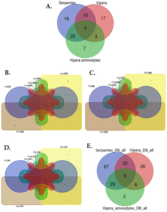 A Venn diagram was generated using the Venn diagram tool (https://bioinformatics.psb.ugent.be/webtools/Venn/ (accessed on 1 November 2024)) by inputting protein accession numbers. This step aimed to (a) assess the protein distribution for fraction 0 using different FASTA databases, (b) evaluate the protein distribution for all fractions using Serpentes DB, (c) assess protein distribution for all fractions using Vipera DB, (d) evaluate the protein distribution for all fractions using V. ammodytes DB and (e) analyze the protein distribution (master proteins, two unique peptides, 1% FDR) for all fractions using different FASTA databases.
