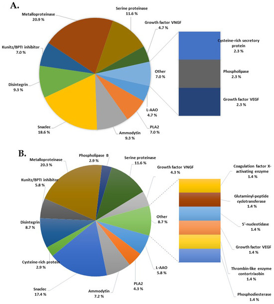 Relative distribution of protein groups (%) in the Vaa venom determined by nano-liquid chromatography–tandem mass spectrometry-based proteomics: (A) DB V. ammodytes; (B) DB Vipera.