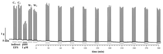 The mean value of NPD contractions in the first two control “packages” (C1 and C2) is 2.88 ± 0.13 g. After the administration of 1 μM pancuronium, the contractions of the NPD decreased to 51.20% of the mean value of the contractions of the control “packages” C1 and C2. The neuromuscular blockade by pancuronium was reversible, and after its washout from the organ bath, the contractions normalized and reached the following values: the W1 “package” 93.02% and the W2 “package” 87.25% of the control contractions C1 and C2. The first 5 “packages” (C1, C2, pancuronium 1 μM, W1, W2) confirm that NPD contractions are induced by indirect EFS. Over the next 10 “packages” in a 300 min period, contractions were stable as a function of time, and 5 contractions within each “package” were uniform in the amplitude of contractions, i.e., standard deviations (±SD).