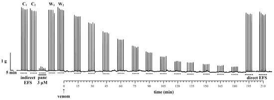 In the next part, a series of NPD contractions were performed under the influence of the venom as a function of time. A representative recording of EFS-induced NPD contractions under the influence of the venom is shown in Figure 5.