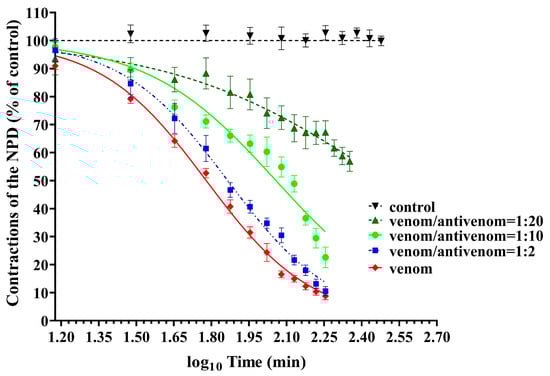Logarithmic functions of time (log10, minutes) and normalization of effects (% of control NPD contractions) were used to generate sigmoidal curves of reduction in NPD contractions under the influence of venom and venom/antivenom mixtures at different mass ratios (1:2; 1:10; 1:20) (Figure 6).