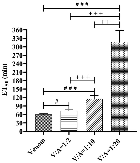 Comparison of ET50 (minutes) after the administration of venom and a venom/antivenom mixture at the ratios of 1:2; 1:10 and 1:20 (w/w) (mean ± SD, # p < 0.05, ### p < 0.001 vs. venom; +++ p < 0.001 between different mass ratios of venom/antivenom).