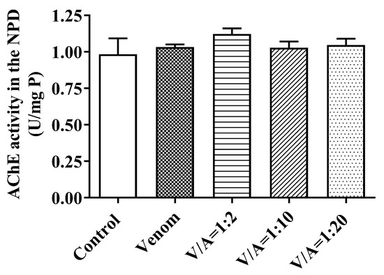 No statistically significant difference (p > 0.05) was found in AChE enzyme activity in NPD under the influence of venom and venom/antivenom mixtures at all mass ratios tested compared to the control group (Figure 9).