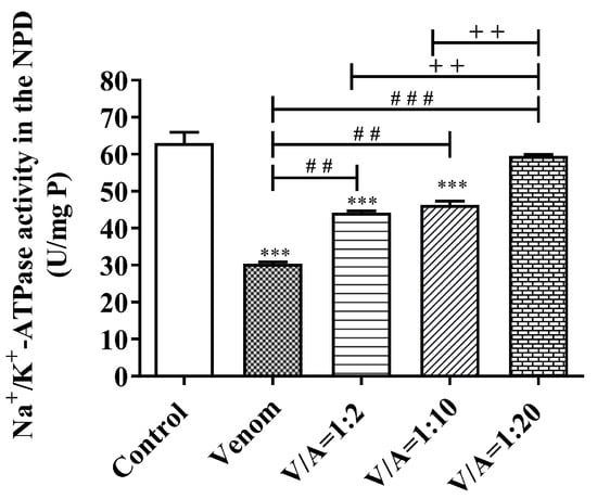 The enzyme Na+/K+-ATPase (sodium-potassium pump) plays a decisive role in the generation of the concentration gradient across the cell membrane and the maintenance of the resting membrane potential. This enzyme consumes a considerable amount of energy for its function in many cells, especially in nerve and muscle cells. It is estimated that under standard resting conditions, 19 to 28% of total ATP in the body is used for Na+/K+-ATPase function. Under normal conditions, maintaining ionic gradients in brain neurons requires 50–60% of total oxygen consumption coupled to ATP synthesis, most of which is consumed by the Na+/K+-pump [70,71,72,73]. These data indicate that the lack of the cellular energy currency ATP leads to a significant reduction in the activity of Na+/K+-ATPase, particularly in nervous tissue. Ammodytoxin A (AtxA), the most toxic PLA2 of the Vaa venom, is selectively and rapidly internalized into the presynaptic terminals of motor neurons and then translocated into the mitochondrial intermembrane space and matrix [74,75]. Moreover, Ivanušec et al. [74] also found that the phospholipase activity of AtxA is not obligatory for its rapid intracellular and subcellular internalization. Since we have shown by the proteomic analysis of Vaa venom that AtxA is a protein with a low molecular weight of 15.5 kDa, we hypothesize that this could also be the reason for its rapid entry into mitochondrial structures. Mitochondria are very sensitive to fatty acids, lysophosphatides and PLA2, and their damage leads to a decrease in ATP production and the deenergization of terminal nerve endings [64]. As a result, the Na+/K+-ATPases lack energy support and their activity is inhibited. In this way, many important functions are disrupted, including the generation of axonal and synaptic membrane potentials and the mobilization of synaptic vesicles for the exocytosis of neurotransmitters [76]. In a study carried out on a neuromuscular preparation of the diaphragm, the neurotoxic effects of AtxA were investigated. Electron microscopy showed the most pronounced changes in the mitochondria of the presynaptic nerve endings. The mitochondria were swollen and damaged, with a disrupted mitochondrial cristae structure [64]. This finding supports our results showing that there is a highly significant (p < 0.001) inhibition of Na+/K+-ATPase in NPD under the influence of Vaa venom (Figure 10). The mixture with the highest proportion of antivenom (1:20) almost completely restored Na+/K+-ATPase activity (94.55% of the control). The Pearson correlation revealed a very strong positive correlation (r = 0.9150, p < 0.001) between the increasing activity of the Na+/K+-ATPase and the increasing concentration of the antivenom. Therefore, we conclude that the antivenom effectively prevents the Vaa venom from causing a reduction in Na+/K+-ATPase activity. We did not find any studies on the effect of Viperidae venom on Na+/K+-ATPase activity in NPD in the available literature.