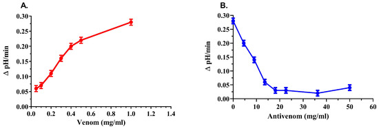 The activity of PLA2 of the venom of Vaa was determined according to the modified methods of Tan and Tan [41]. A fresh solution of the substrate was prepared by mixing egg yolk (380 g) with 18.1 mM sodium deoxycholate and 8 mM CaCl2 at a ratio of 1:1:1 (v/v/v) overnight at room temperature. The pH was adjusted to 8.1 with 0.15 M NaOH. The venom solution was added to a substrate at a concentration range of 0.05 to 1 mg/mL, and the pH change was observed for 60 s. All measurements were carried out in triplicate (n = 3). To test the neutralization of PLA2 by antivenom, a 1 mg/mL solution of the venom was used. Antivenom concentrations from 5 to 50 mg/mL were tested. The test was performed after the incubation of the venom/antivenom mixture at 37 °C for 30 min. The results are expressed as pH change per unit time (ΔpH/min).
