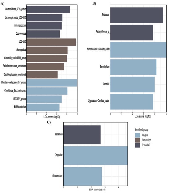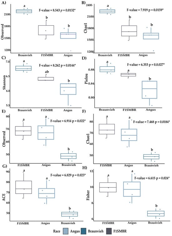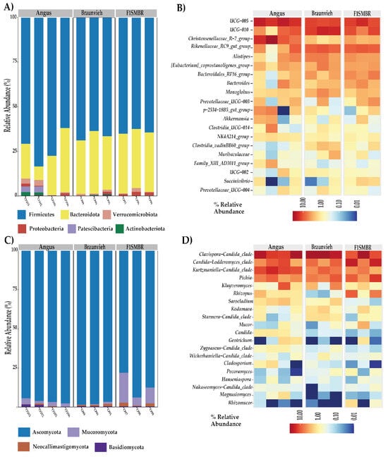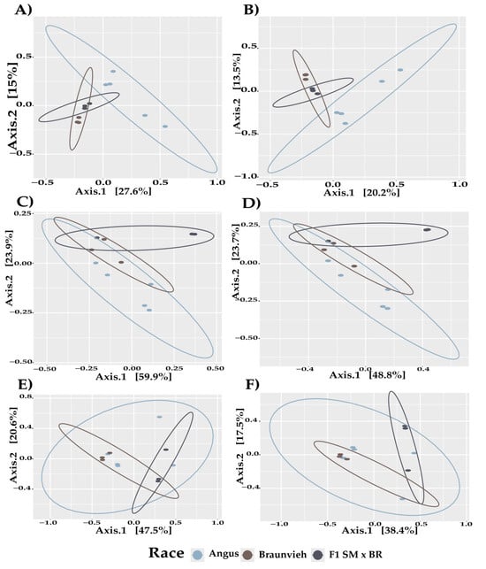- Fan, P.; Nelson, C.D.; Driver, J.D.; Elzo, M.A.; Jeong, K.C. Animal Breed Composition Is Associated with the Hindgut Microbiota Structure and β-Lactam Resistance in the Multibreed Angus-Brahman Herd. Front. Microbiol. 2019, 10, 1846. [Google Scholar] [CrossRef] [PubMed]