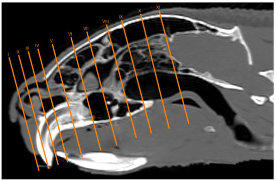 No anatomic differences were identified in the heads of the five porcupines in this study. Images displaying relevant anatomical structures of the porcupine nasal cavity and paranasal passages are presented (Figure 1, Figure 2, Figure 3, Figure 4, Figure 5, Figure 6, Figure 7, Figure 8, Figure 9, Figure 10, Figure 11 and Figure 12). Figure 1 is a sagittal CT image, with lines and numbers (I-XI) indicating approximately the level of the following anatomical and transverse CT images. Figure 2, Figure 3, Figure 4, Figure 5, Figure 6, Figure 7, Figure 8, Figure 9, Figure 10, Figure 11 and Figure 12 consist of three transverse images: (A) an anatomical cross-section, (B) a bone CT window image, and (C) a lung CT window image. The images progress from the nose (Figure 2) to the ethmoidal labyrinth (Figure 12).