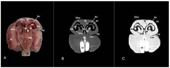 In the last anatomical images, we identify some brain structures, including the olfactory bulb and the olfactory recess (Figure 12A). Moreover, there is a clear distinction between the eye and its associated structures. Therefore, we distinguished the vitreous chamber, the sclera and the optic nerve, and the dorsal and ventral rectus muscles (Figure 11A). Moreover, we observed pivotal muscles associated with the masticatory activity, including the lateral and medial pterygoid muscles, the temporalis, the superficial and deeper portions of the masseter, and the buccinator muscle (Figure 9A, Figure 10A, Figure 11A and Figure 12A).
