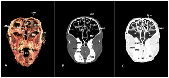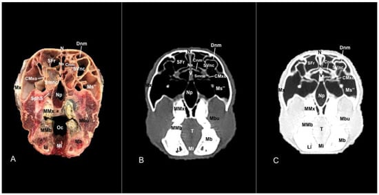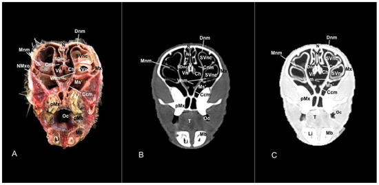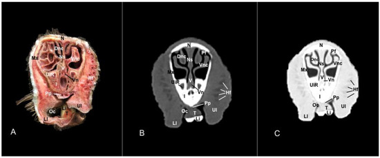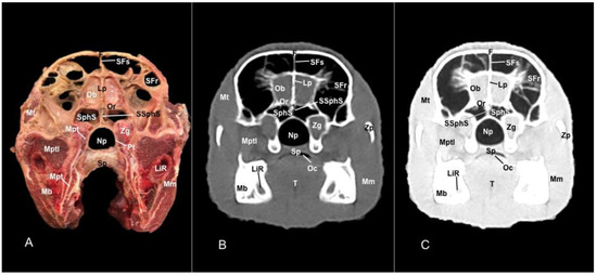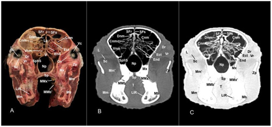 In contrast, this section displayed the incisive bone and the lower incisors with a high degree of attenuation. More caudal sections allowed the visualization of other bones that constitute the nasal cavity, including the nasal, the palatine, the maxillary, the vomer, and the ethmoid bones showing hyperattenuating signal (Figure 3B,C, Figure 4B,C, Figure 5B,C, Figure 6B,C, Figure 7B,C, Figure 8B,C, Figure 9B,C, Figure 10B,C, Figure 11B,C and Figure 12B,C). In addition, most parts of the nasal cavities and paranasal sinuses were displayed with the corresponding CT sections, which were easily identified due to the intraluminal gas content effect. Therefore, we distinguished the oral cavity, the nasopharyngeal duct, as well as the dorsal, ventral, and medial nasal conchal recesses, the maxillary, the frontal, and the sphenopalatine sinuses (Figure 8B,C, Figure 9B,C, Figure 10B,C, Figure 11B,C and Figure 12B,C).