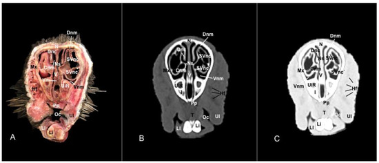 The imaging study was conducted at the Veterinary Hospital of Las Palmas de Gran Canaria University using a 16-slice helical CT scanner (Toshiba Astelion, Canon Medical System, Tokyo, Japan). The five porcupines were placed in ventral recumbency on the CT scan table. The CT scan produced sequential transverse images with a thickness of 1 mm using a standard clinical protocol (100 kVp, 80 mA, 512 × 512 acquisition matrix, 1809 × 858 field of view, a spiral pitch factor of 0.94, and a gantry rotation of 1.5 s). To distinguish the CT appearance of the nasal cavity, two CT windows with different widths and levels were used: a bone window setting (WW = 1500; WL = 300), and a pulmonary window setting (WW = 1400; WL = −500). In addition, dorsal and sagittal multiplanar reconstructed (MPR) images were also obtained to enhance the identification of normal porcupine anatomical structures. All the CT images were imported to an image viewer (OsiriX MD, Apple, Cupertino, CA, USA) for data manipulation and analysis.