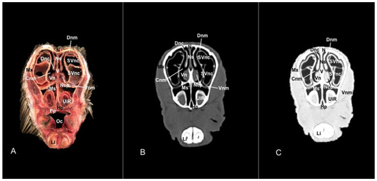 We obtained transverse anatomical cross-sections of three animals after the scanning to help us identify the structures in the CT images. The animals were placed in a plastic holder, frozen (−80 °C), and then sliced into 1 cm sections using an electric band saw. These sections, thicker than the CT images, were cleaned with water, numbered, photographed, and compared with the corresponding CT view. We selected the sections that best matched the CT images to identify the relevant structures of the porcupine’s sinuses and nasal passages. In addition, we used anatomical texts and reputable references to aid in our identification process [14,15,16,20,22,23,24,25,26,27,28,29,30,31,32,33].