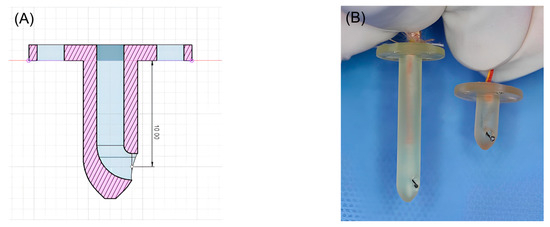 (A) Blueprint for 3D-printed guides capable of measuring 1cm depth. (B) Three-dimensional-printed guides for inserting the Type K thermocouple probe temperature sensor.