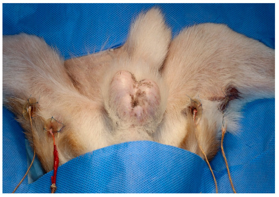 Two 3D-printed guides of different depths were secured to the skin using sutures on each hindlimb. A 1 cm skin incision was made at two points, dividing the posterior thigh into three sections. The caudal border of the gracilis muscle was then bluntly dissected. A 3 cm 3D guide and probe were inserted at the proximal site, and a 1 cm 3D guide and probe were inserted at the distal site. The sensors were inserted into the medio-caudal thigh using 3D-printed guides (Figure 2). The sensors were then connected to a digital thermometer (SDT25, SUMMIT) to determine the temperature of the muscle tissue. Oesophageal temperature probes were used to monitor core body temperature. All temperatures were recorded every minute.