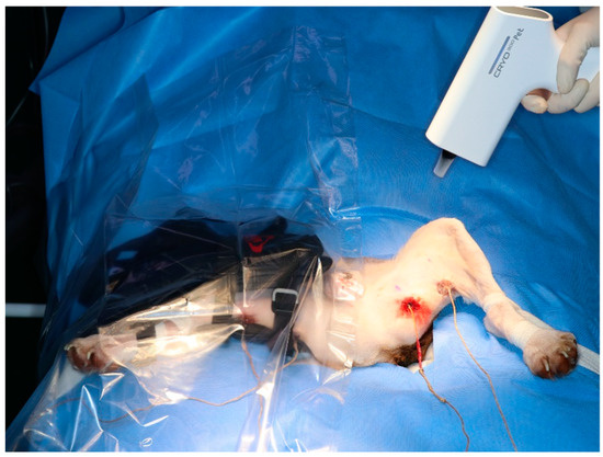 The mean weight of the nine dogs was 8.1 kg (range: 6.0–10.2 kg), with an average age of 1.6 years (range: 1–2 years). The body condition scores of all the dogs ranged from 4 to 5 on a nine-point scale. Three modalities were used to test the dogs, with nine limbs being tested in each modality, resulting in the 18 limbs included in the study. The set ambient room temperature was 21 °C for the duration of the study. The forced-air warming system was set at 43 °C to maintain the dog’s body temperature.