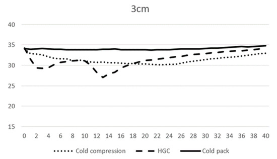 At 40 min, the last temperature was measured, and the average temperature for the CC, HGC, and CP groups was 32.0, 33.8, and 34.2 °C at 1 cm, respectively, and 33.0, 34.0, and 34.8 °C at 3 cm. At 1 cm depth, CC decreased by 0.7° while HGC and CP increased by 1.0 and 1.2 °C, respectively, compared to 0 min. At 3 cm depth, CC and HGC decreased by 1.1 and 0.2 °C, respectively, while CP increased by 0.6 °C (Table 3).