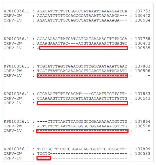 Whole genome nucleotide sequence alignment analysis. The deleted region of ORFV-1V is represented by the red box.