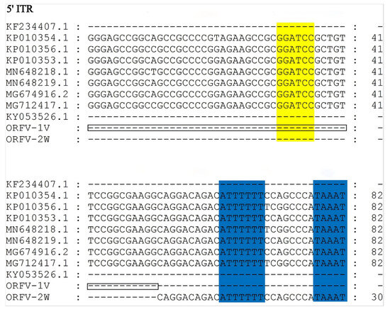 Alignment of ITR sequences from the ORFV-1V and ORFV-2W genomes with those from other isolates. The left terminal 5’-ITR sequences of eleven ORFV isolates were compared using MEGA version 11. The BamHI terminal region (GGATCC) and the telomere resolution sequence (ATT TTTT-N(8)-TAAAT) are indicated as yellow and blue boxes, respectively. The deletion region of ORFV-1V is indicated as a black box.