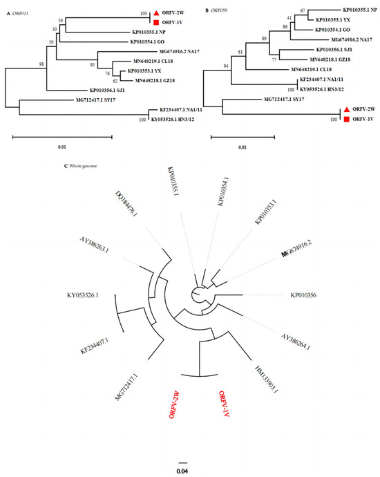 Phylogenetic analysis based on two genes (i.e., ORF011 and ORF059) and whole genome sequence data. Phylogenetic trees were constructed using the neighbor-joining method in MEGA version 11. Numbers above or below branch points indicate the bootstrap support calculated for 1000 replicates. Shown are trees using sequence data for: (A) B2L (ORF011) and (B) F1L (ORF059). Here, ORFV-1V and ORFV-2W are represented by red triangles and red squares, respectively. Also shown is a tree using (C) whole genome sequence data. ORFV-1V and ORFV-2W are shown in red font.