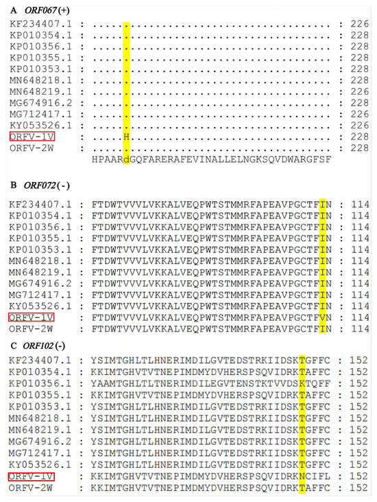 Alignment of amino acid sequences of ORF067, ORF072, and ORF102. The sequences of ORFV-1V and other isolates were aligned using MEGA version 11. (A) ORF067. (B) ORF072. (C) ORF102. ORFV-1V is highlighted with a red box for emphasis. Amino acid mutation sites are represented by yellow boxes.