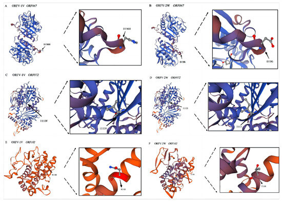 Prediction of the tertiary structures of proteins encoded by ORF067, ORF072, and ORF102 of the ORFV-1V and ORFV-2W genomes. Tertiary protein structures were predicted using SWISS-MODEL. The template coverage of each of the above proteins is >50%, and all GMQE > 0.2, which indicates that the prediction results are reliable. (A) ORFV-1V ORF067. (B) ORFV-2W ORF067. (C) ORFV-1V ORF072. (D) ORFV-2W ORF072. (E) ORFV-1V ORF102. (F) ORFV-2W ORF102. Amino acid sites are indicated by black arrows. D196H indicates the mutation of amino acid 196 from aspartic acid (Asp) to histidine (His). I113V shows the mutation of isoleucine (Ile) to valine (Val) at position 113. N148 shows the mutation of amino acid 148 to asparagine (Asn).